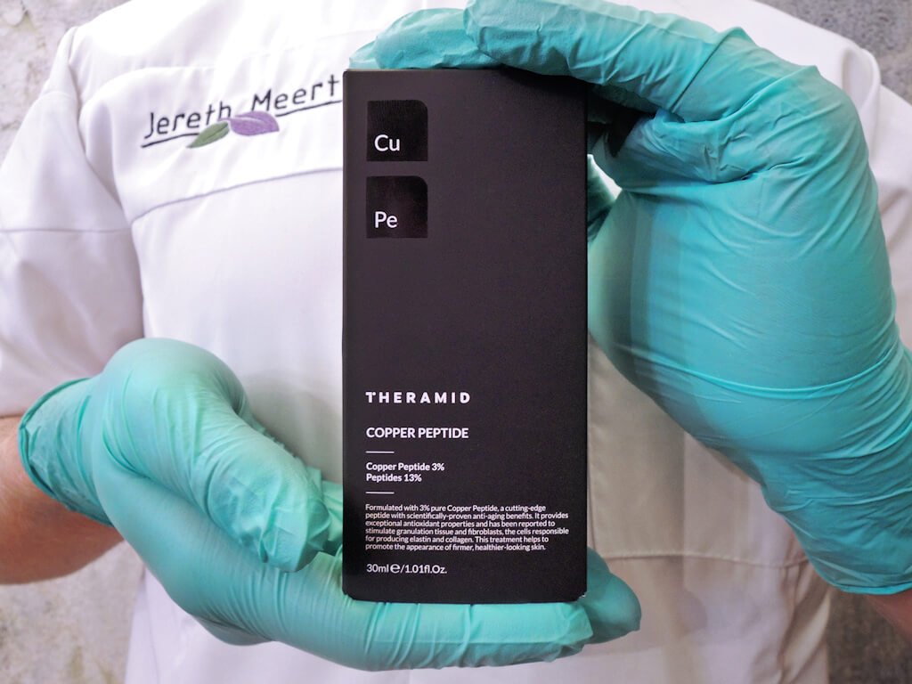 Wil je je huidverzorgingsroutine verbeteren, maar lukt het je 's avonds gewoonweg niet? Overweeg dan een product met koperpeptiden! Deze kleine ketens van aminozuren kunnen overdag gebruikt worden en toch bieden ze je een ideale thuisbehandeling voor littekenherstel, anti-aging collageen- en elastineproductie. Mijn huidige favoriet is het serum van Theramid, dat maar liefst 16% nuttige peptiden bevat, waarvan 3% koper. Ik heb er niet veel op voorraad, dus vraag het gerust als je langskomt!